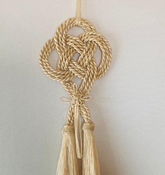 その精麻を縁結びの意味を持つ縁起の良い淡路結びにして部屋飾り用サイズで作っています。